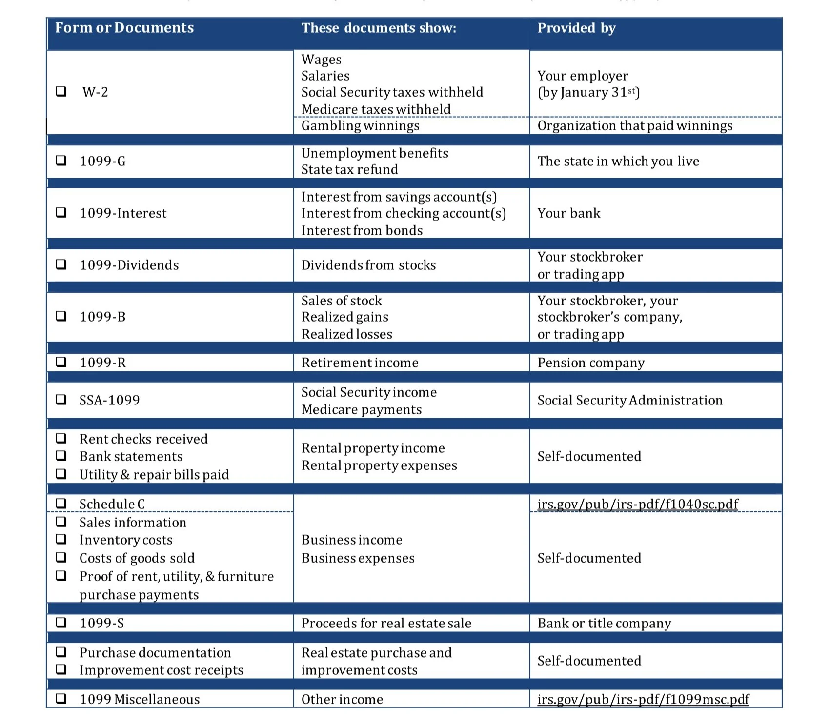 Here, we will break down what you will need, related to income, when preparing to file your taxes for last year. Below is a basic list you can use to check that you have the common documents you need in order to prepare your taxes. You may need additional documents for each list. Not every document may apply to you.